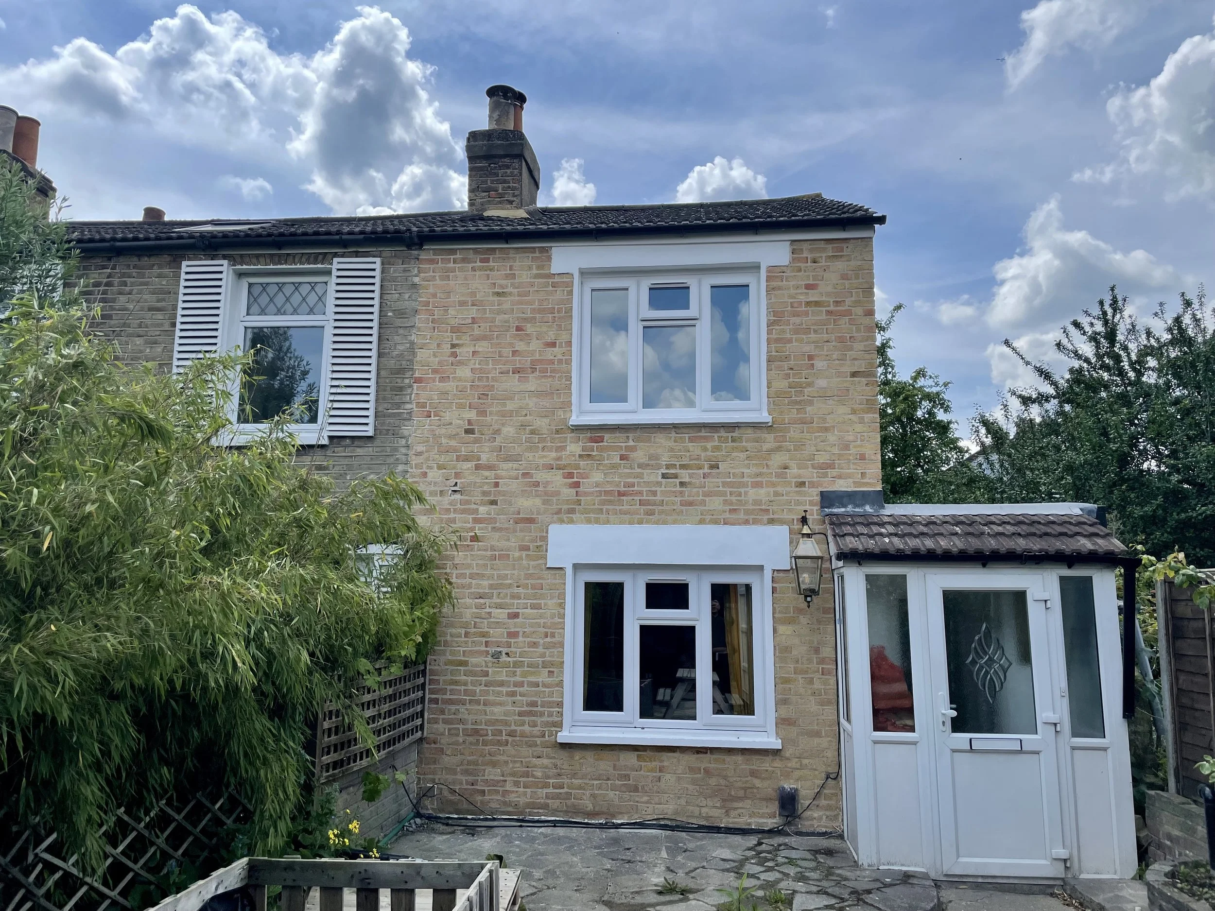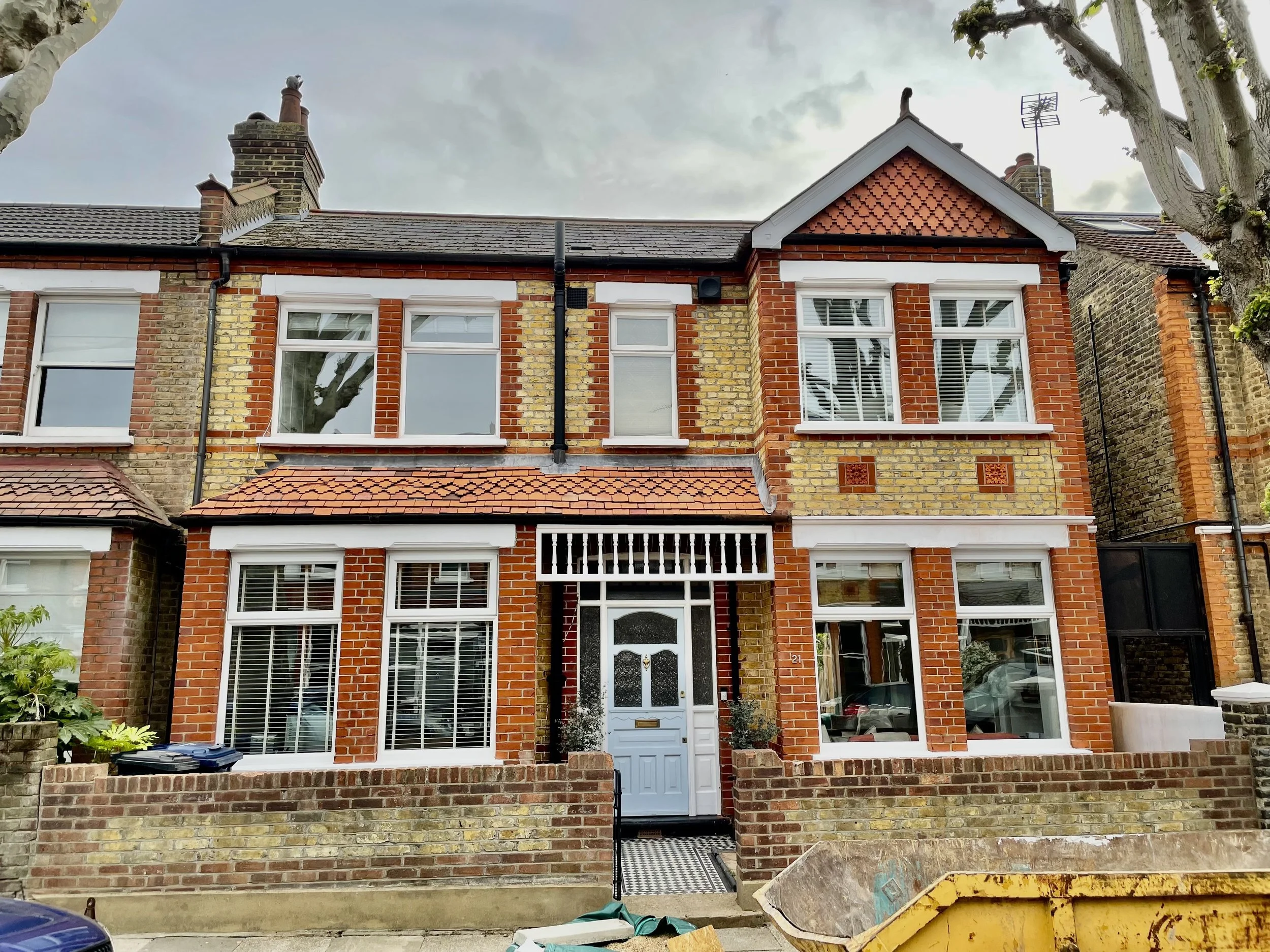 The house facade has been restored by removingcthe paint from brickwork, cleaning the bricks, raking the old mortar and repointing with lime mortar in weather struck style. The stone has been restored also.